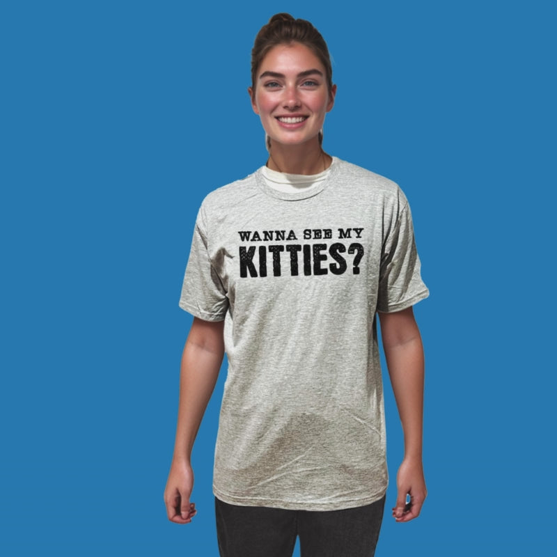 This funny Wanna See My Kitties flip shirt is perfect for anyone who loves cats and has an adult sense of humor. Flip the shirt up to reveal a hidden pair of kittens!